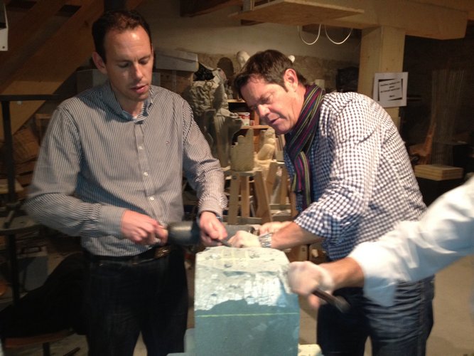 Gemeinses Erstellen eines Symbols aus Sandstein im Künstleratelier des Steinhauers Marc Bucher in des Altstadt Freiburg.